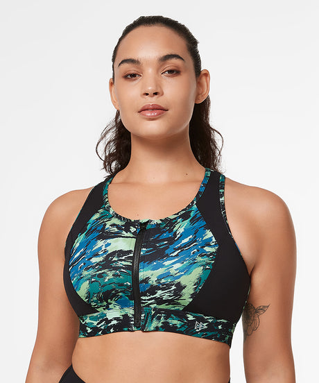 Echo Abstract Print Zip Racerback Padded Running Bra